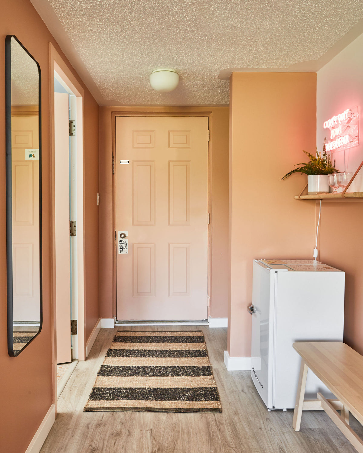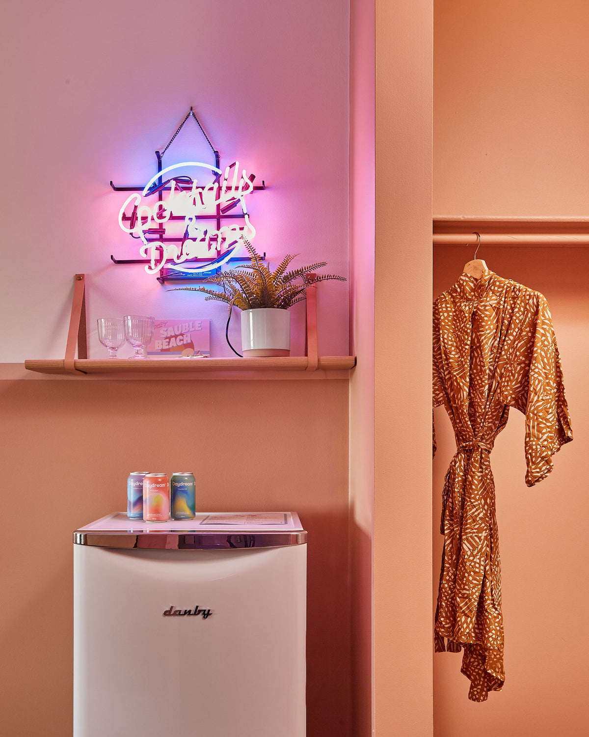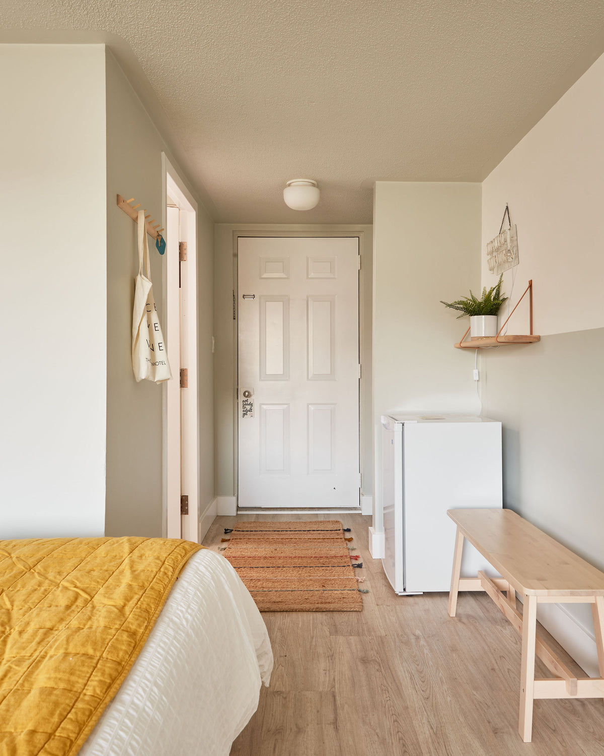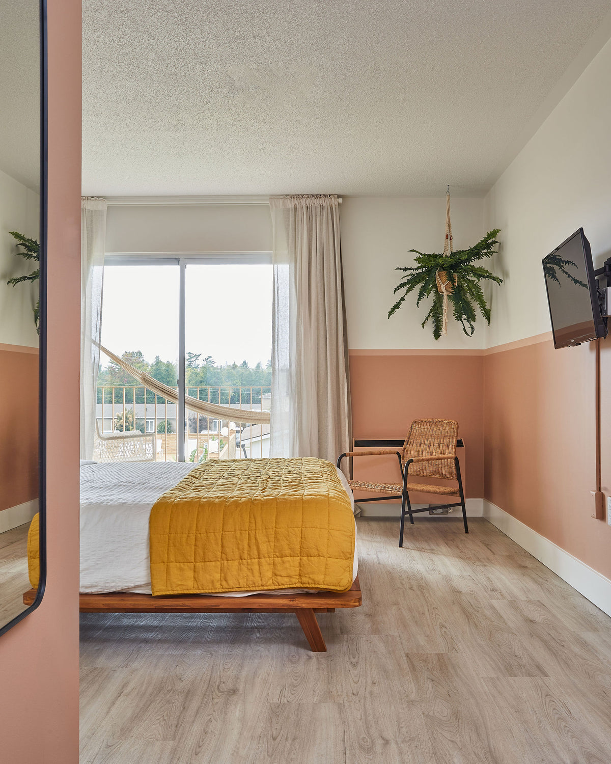 Our king rooms are what we like to call “motel luxe”, with a designer king bed, sun-bleached wallpaper and blush glow. Enjoy a spacious patio, and watch the sun go down over the pool. For couples looking to level-up the romance, we can add-on bubbly for your arrival.