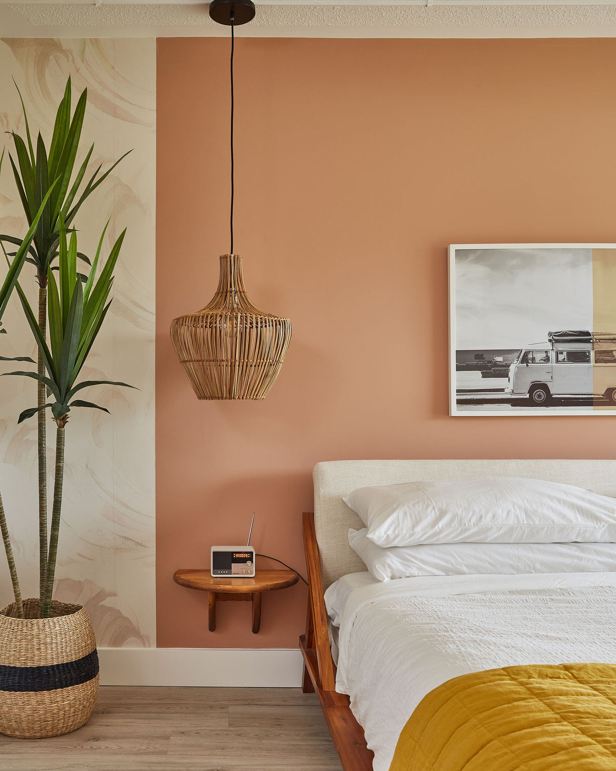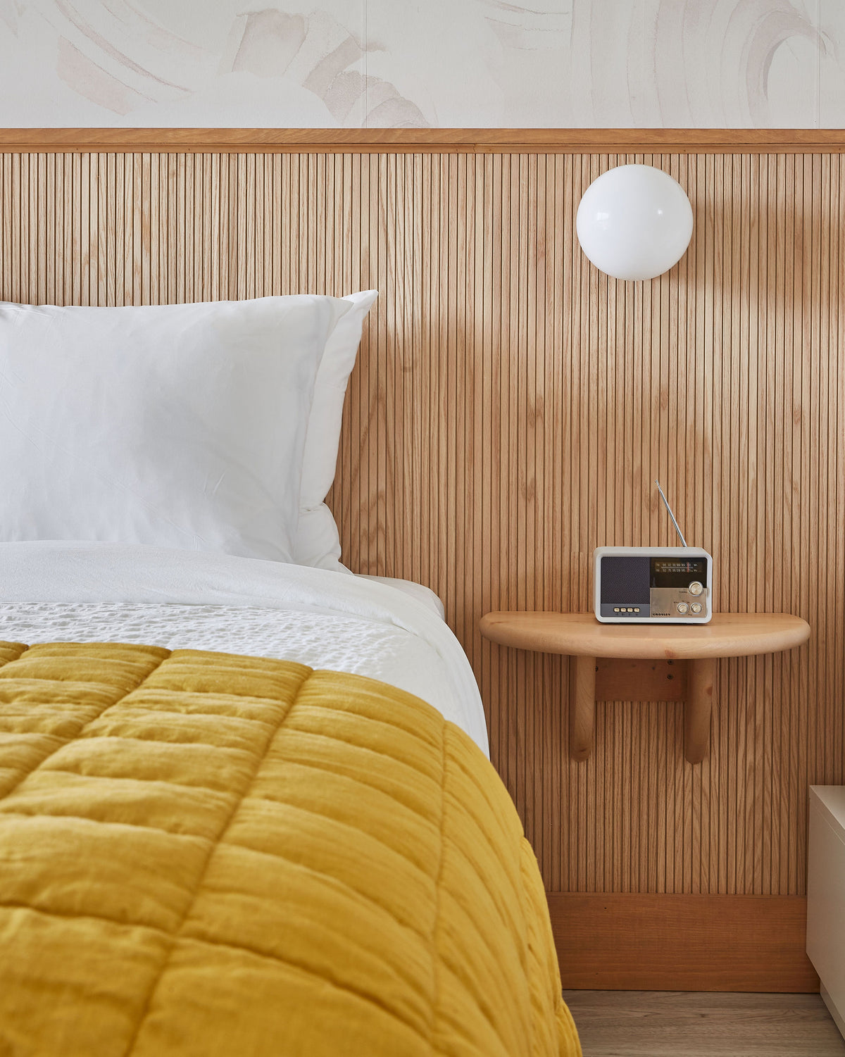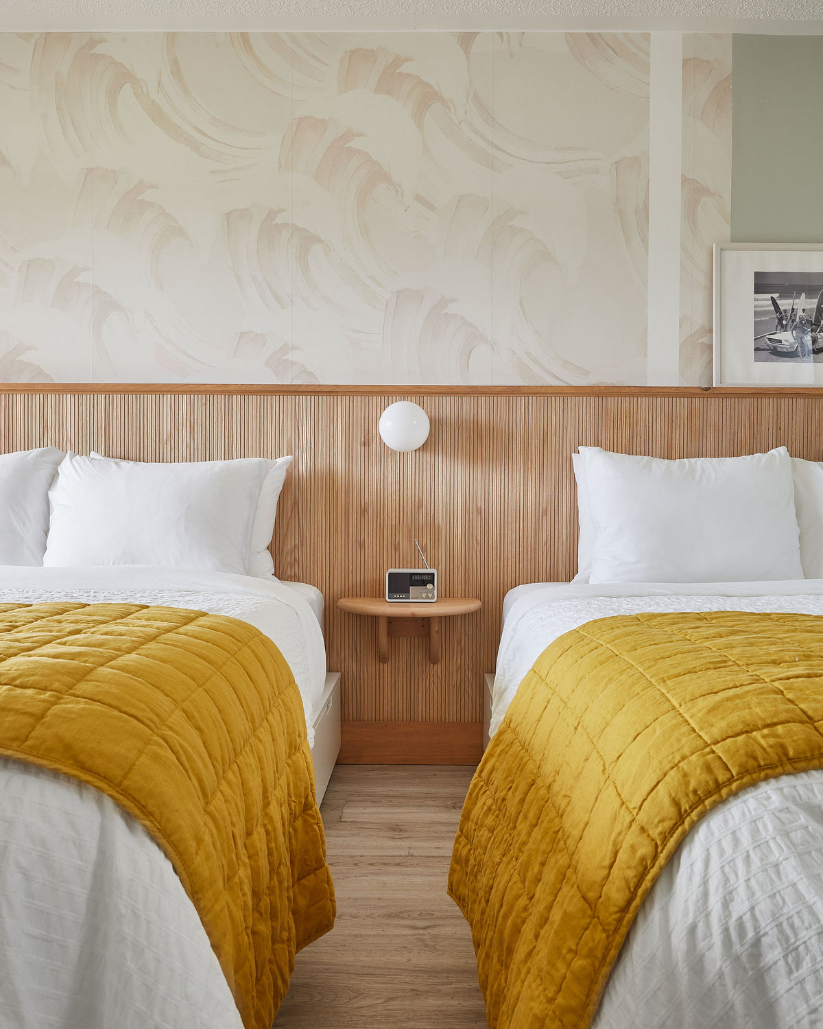 This is the perfect room for a getaway with your BFFs or the whole family. With a feature wood paneled headboard, retro surf prints and sun-bleached wallpaper, this room has all of the 1970s good vibes. These rooms all have a patio with a pool view.